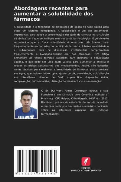 A solubilidade é o fenómeno de dissolução do sólido na fase líquida para obter um sistema homogéneo. A solubilidade é um dos parâmetros importantes para atingir a concentração desejada do fármaco na circulação sistémica, para que se verifique uma resposta farmacológica. É geralmente reconhecido que a fraca solubilidade é uma das dificuldades mais frequentemente encontradas no domínio da farmácia. A baixa solubilidade e a subsequente taxa de dissolução insatisfatória comprometem frequentemente a biodisponibilidade oral dos fármacos. Este artigo demonstra as várias técnicas utilizadas para melhorar a solubilidade aquosa, o que pode ser uma ajuda valiosa para aumentar a eficácia e reduzir os efeitos secundários dos medicamentos. Assim, são utilizadas várias técnicas para melhorar a solubilidade de fármacos pouco solúveis em água, que incluem hidrotropia, ajuste do pH, cosolvência, solubilização em miscelânea, técnicas de fluido supercrítico, dispersão sólida, complexação, microemulsão, utilização de tensioactivos e nanonização.