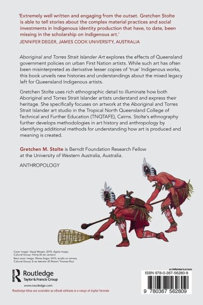 Gretchen Stolte uses rich ethnographic detail to illuminate how both Aboriginal and Torres Strait Islander artists understand and express their heritage. She specifically focuses on artwork at the Aboriginal and Torres Strait Islander art studio in the Tropical North Queensland College of Technical and Further Education (TNQT TAFE), Cairns. Stolte's ethnography further develops methodologies in art history and anthropology by identifying additional methods for understanding how art is produced and meaning is created.