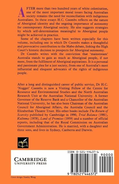 After more than two hundred years of white colonisation, one of the most important moral issues facing Australian society remains the need for reconciliation with indigenous Australians. In these essays H.C. Coombs reflects on the nature of Aboriginal identity and the ongoing importance of autonomy for contemporary Aboriginal society. He also suggests strategies by which self-determination meaningful to Aboriginal people might be achieved in practice. Some of the chapters have been written especially for this volume, including one in which Dr. Coombs makes a thoughtful and provocative contribution to the Mabo debate, linking the High Court's historic decision to prospects for Aboriginal autonomy. Dr Coombs writes with the conviction that 'mainstream' Australia stands to gain as much as Aboriginal people, if not more, from the fulfillment of Aboriginal aspirations. It is a personal and passionate plea for a just society, from one of Australia's most influential and eloquent advocates of the rights of indigenous people.