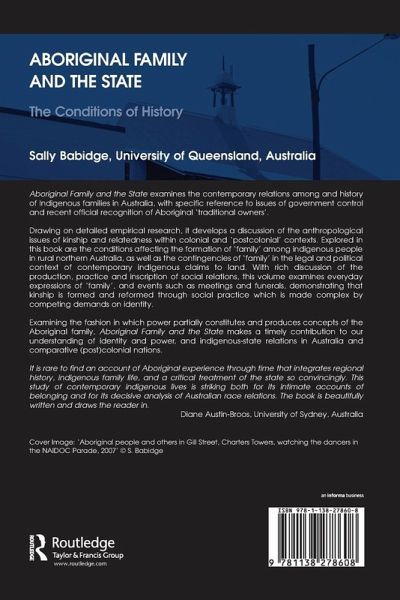 Aboriginal Family and the State examines the contemporary relations and history of Indigenous families in Australia, specifically referencing issues of government control and recent official recognition of Aboriginal 'traditional owners'. Drawing on detailed empirical research, it develops a discussion of the anthropological issues of kinship and relatedness within colonial and 'postcolonial' contexts. This volume explores the conditions affecting the formation of 'family' among indigenous people in rural northern Australia, as well as the contingencies of 'family' in the legal and political context of contemporary indigenous claims to land. With a rich discussion of the production, practice and inscription of social relations, this volume examines everyday expressions of 'family', and events such as meetings and funerals, demonstrating that kinship is formed and reformed through a complicated social practice of competing demands on identity.