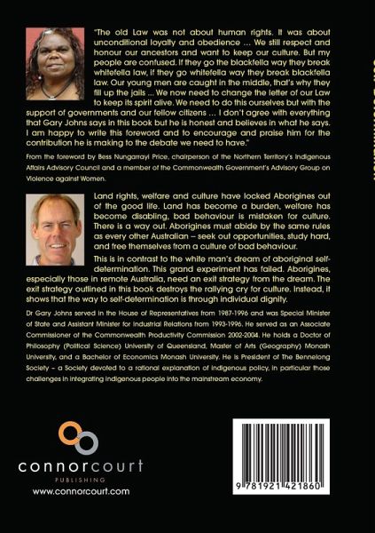 Land rights, welfare and culture have locked aborigines out of the good life. Land has become a burden, welfare has become disabling, bad behaviour is mistaken for culture. There is a way out. Aborigines must abide by the same rules as every other Australian -- seek out opportunities, study hard, and free themselves from a culture of bad behaviour. This is in contrast to the white man's dream of Aboriginal self-determination. This grand experiment has failed. Aborigines, especially those in remote Australia, need an exit strategy from the dream. The exit strategy outlined in this book destroys the rallying cry for culture. Instead, it shows that the way to self-determination is through individual dignity.