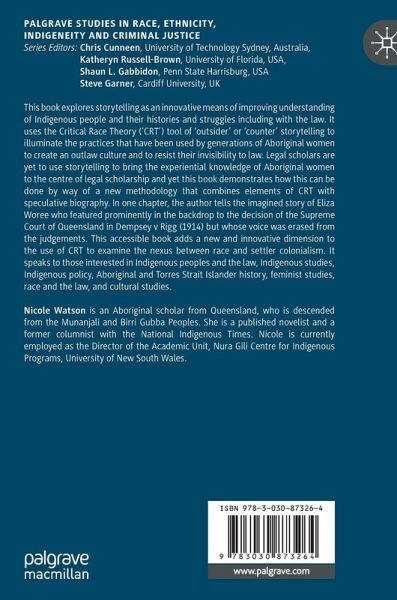 This book explores storytelling as an innovative means of improving understanding of Indigenous people and their histories and struggles including with the law. It uses the Critical Race Theory ('CRT') tool of 'outsider' or 'counter' storytelling to illuminate the practices that have been used by generations of Aboriginal women to create an outlaw culture and to resist their invisibility to law. Legal scholars are yet to use storytelling to bring the experiential knowledge of Aboriginal women to the centre of legal scholarship and yet this book demonstrates how this can be done by way of a new methodology that combines elements of CRT with speculative biography. In one chapter, the author tells the imagined story of Eliza Woree who featured prominently in the backdrop to the decision of the Supreme Court of Queensland in Dempsey v Rigg (1914) but whose voice was erased from the judgements. This accessible book adds a new and innovative dimension to the useof CRT to examine the nexus between race and settler colonialism. It speaks to those interested in Indigenous peoples and the law, Indigenous studies, Indigenous policy, Aboriginal and Torres Strait Islander history, feminist studies, race and the law, and cultural studies.
