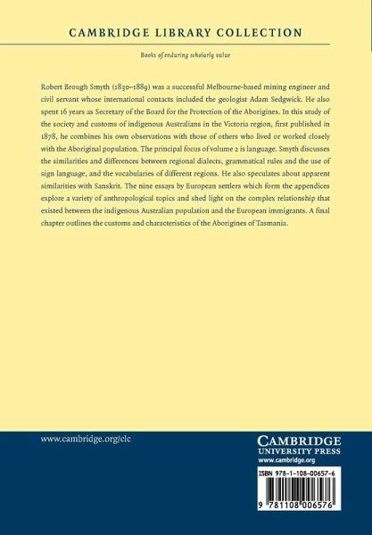 Robert Brough Smyth (1830-1889) was a successful Melbourne-based mining engineer and civil servant who spent 16 years as Secretary of the Board for the Protection of the Aborigines. In this study of the society and customs of indigenous Australians in the Victoria region, first published in 1878, he combines his own observations with those of others who lived or worked closely with the Aboriginal population. The principal focus of volume 2 is language. Smyth discusses the similarities and differences between regional dialects, grammatical rules and the use of sign language, and the vocabularies of different regions. The nine essays by European settlers which form the appendices explore a variety of anthropological topics and shed light on the complex relationship that existed between the indigenous Australian population and the European immigrants. A final chapter outlines the customs and characteristics of the Aborigines of Tasmania.