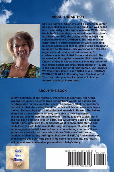 Inspiring stories about aborted babies in Heaven. Tammy, one of the babies aborted, wanted to be a a newspaper reporter. Now that she is in heaven, she interviews other babies who were aborted. They give her specific accounts of what led to their abortions.