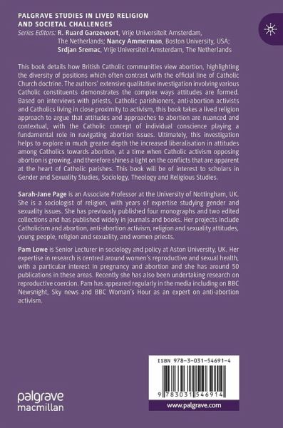 This book details how British Catholic communities view abortion, highlighting the diversity of positions which often contrast with the official line of Catholic Church doctrine. The authors' extensive qualitative investigation involving various Catholic constituents demonstrates the complex ways attitudes are formed. Based on interviews with priests, Catholic parishioners, anti-abortion activists and Catholics living in close proximity to activism, this book takes a lived religion approach to argue that attitudes and approaches to abortion are nuanced and contextual, with the Catholic concept of individual conscience playing a fundamental role in navigating abortion issues. Ultimately, this investigation helps to explore in much greater depth the increased liberalisation in attitudes among Catholics towards abortion, at a time when Catholic activism opposing abortion is growing, and therefore shines a light on the conflicts that are apparent at the heart of Catholic parishes. Thisbook will be of interest to scholars in Gender and Sexuality Studies, Sociology, Theology and Religious Studies.