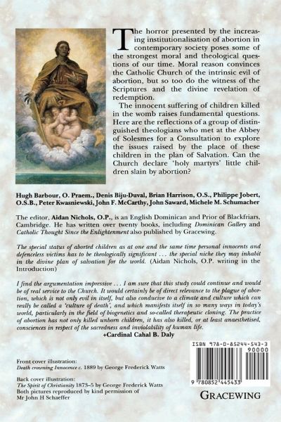 The horror presented by the increasing institutionalisation of abortion in contemporary society poses some of the strongest moral and theological questions of our time. Moral reason convinces the Catholic Church of the intrinsic evil of abortion, but so too do the witness of the Scriptures and the divine revelation of redemption. The innocent suffering of children killed in the womb raises fundamental questions. Here are the reflections of a group of distinguished theologians who met at the Abbey of Solesmes for a Consultation to explore the issues raised by the place of these children in the plan of Salvation. Can the Church declare 'holy martyrs' little children slain by abortion? "I find the argument impressive ... I am sure that this study could continue and would be of real service to the Church. It would certainly be of direct revelance to the plague of abortion, which is not only evil in itself, but also conducive to a climate and culture which can really be called 'a culture of death', and which manifests itself in so many ways in today's world, particularly in the field of biogenetics and so-called therapeutic cloning. The practice of abortion has not only killed unborn children, it has also killed, or at least anaesthetised, consciences in respect of the sacredness and inviolability of human lide." Cardinal Cahal B. Daly
