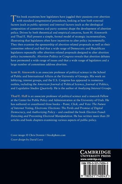 This book examines how legislators have juggled their passions over abortion with standard congressional procedures, looking at how both external factors (such as public opinion) and internal factors (such as the ideological composition of committees and party systems) shape the development of abortion policy. Driven by both theoretical and empirical concerns, Scott H. Ainsworth and Thad E. Hall present a simple, formal model of strategic incrementalism, illustrating that legislators often have incentives to alter policy incrementally. They then examine the sponsorship of abortion-related proposals as well as their committee referral and find that a wide range of Democratic and Republican legislators repeatedly offer abortion-related proposals designed to alter abortion policy incrementally. Abortion Politics in Congress reveals that abortion debates have permeated a wide range of issues and that a wide range of legislators and a large number of committees address abortion.