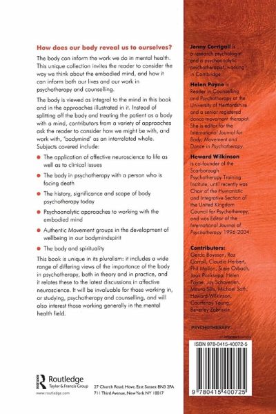 Jenny Corrigall is a research psychologist and a psychoanalytic psychotherapist, working in Cambridge. Helen Payne is Reader in Counselling and Psychotherapy at the University of Hertfordshire and a Senior Registered Dance Movement Therapist. She is Editor for the International Journal for Body, Movement and Dance in Psychotherapy. Heward Wilkinson is co-founder of the Scarborough Psychotherapy Training Institute, until recently was Chair of the Humanistic and Integrative Section of the United Kingdom Council for Psychotherapy, and was Editor of the International Journal of Psychotherapy 1996-2004.