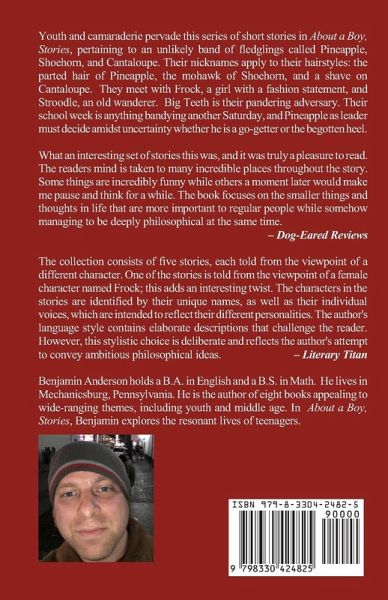 Youth and camaraderie pervade this series of short stories in About a Boy, Stories, pertaining to an unlikely band of fledglings called Pineapple, Shoehorn, and Cantaloupe. Their nicknames apply to their hairstyles: the parted hair of Pineapple, the mohawk of Shoehorn, and a shave on Cantaloupe. They meet with Frock, a girl with a fashion statement, and Stroodle, an old wanderer. Big Teeth is their pandering adversary. Their school week is anything bandying another Saturday, and Pineapple as leader must decide amidst uncertainty whether he is a go-getter or the begotten heel. The story delves into their daily challenges-from interpersonal conflicts to existential musings-framed within everyday settings that spur deep discussions about future aspirations and their paths to achieving them. The collection consists of five stories, each told from the viewpoint of a different character. One of the stories is told from the viewpoint of a female character named Frock; this adds an interesting twist. The characters in the stories are identified by their unique names, as well as their individual voices, which are intended to reflect their different personalities.