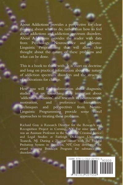 About Addictions provides a perspective for clear thinking about what to do, rather than how to feel about addiction and addiction spectrum disorders. Richard Gray provides the reader with data from Psychology, Neuroscience and Neuro-Linguistic Programming, that will allow clear thought about the nature of these problems and what can be done. As he says in his introduction, this is a book to think with. It is short on doctrine and long on practical information about the nature of addictions and the structure of motivations for change. Gray provides information about diagnosis, reports on studies that say something very important about 'addictive substances' and research in neuroscience, motivation, and preference hierarchies. He provides techniques and perspectives from Neuro-Linguistic Programming to suggest some novel approaches to treating the problem.