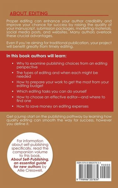 A savvy author needs a working knowledge of editing. With so many paths to publishing nowadays, this is more important than ever. Proper editing can enhance your author credibility and improve your chances for success by raising the quality of your manuscript, submission packages, marketing materials, social media posts, and websites. Many authors overlook these crucial advantages. Even if you're aiming for traditional publication, your project will benefit greatly from professional and timely editing. In this book authors will learn:¿ why to examine publishing choices from an editing perspective¿ the types of editing and when each might be needed ¿ how to prepare your work to get the most out of your editing budget¿ which editing tasks you can do yourself¿ how to choose an effective editor-and where to find one¿ how to save money on editing expenses Improve your progress on the publishing pathway by learning how quality editing can smooth the way for success, however you define it.