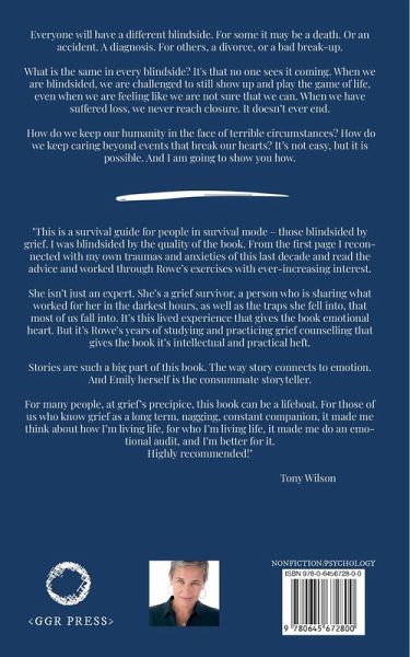 Everyone will have a different blindside. For some it may be a death. Or an accident. A diagnosis. For others, a divorce, or a bad break-up. What is the same in every blindside? It's that no one sees it coming. When we are blindsided, we are challenged to still show up and play the game of life, even when we are feeling like we are not sure that we can. When we have suffered loss, we never reach closure. It doesn't ever end. How do we keep our humanity in the face of terrible circumstances? How do we keep caring beyond events that break our hearts? It's not easy, but it is possible. And I am going to show you how. "This is a survival guide for people in survival mode - those blindsided by grief. I was blindsided by the quality of the book. From the first page I reconnected with my own traumas and anxieties of this last decade and read the advice and worked through Rowe's exercises with ever-increasing interest. She isn't just an expert. She's a grief survivor, a person who is sharing what worked for her in the darkest hours, as well as the traps she fell into, that most of us fall into. It's this lived experience that gives the book emotional heart. But it's Rowe's years of studying and practicing grief counselling that gives the book it's intellectual and practical heft. Stories are such a big part of this book. The way story connects to emotion. And Emily herself is the consummate storyteller. For many people, at grief's precipice, this book can be a lifeboat. For those of us who know grief as a long term, nagging, constant companion, it made me think about how I'm living life, for who I'm living life, it made me do an emotional audit, and I'm better for it. Highly recommended!"