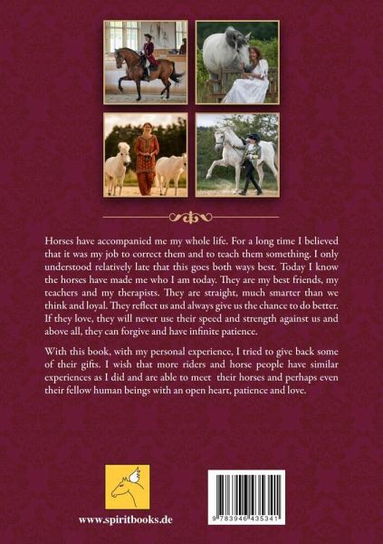 Horses have accompanied me my whole life. For a long time I believedthat it was my job to correct them and to teach them something. I onlyunderstood relatively late that this goes both ways best. Today I knowthe horses have made me who I am today. They are my best friends, myteachers and my therapists. They are straight, much smarter than wethink and loyal. They reflect us and always give us the chance to do better.If they love, they will never use their speed and strength against us andabove all, they can forgive and have infinite patience.With this book, with my personal experience, I tried to give back someof their gifts. I wish that more riders and horse people have similarexperiences as I did and are able to meet their horses and perhaps eventheir fellow human beings with an open heart, patience and love.I have been riding since age 13 and I have started my riding education in the Martin Hölzel Riding School in Stuttgart-Moehringen With my first own horse Flingo, that I got already at age 14 I participated in fox hunts and riding club activities such as jumping and quadrille riding. My riding instructor, Herbert Näher, inspired me to participate in horse shows and in the 70th and 80th I participated in show jumping and dressage at the highest national and international level and in cross country competitions upto a medium level. In the 80th I have been over a year a student of Udo Lange, the most successful professional dressage rider at the time and Mr. Lange inspired me to participate in the higher level of dressage competitions. At the same time I started to get to know a completely different way of dealing with horses at the Karlsruhe Riding Institute of Egon von Neindorff. This way of riding and treating horses has shaped and changed my perspective totally. Four of my five dressage horses have been staying several months in the Riding Institute in Karlsruhe.I said good-bye to horse shows and Herr von Neindorff and I planned to open a small exclusive riding school together with only ten horses. This idea inspired me to buy the agricultural property in Heimsheim.