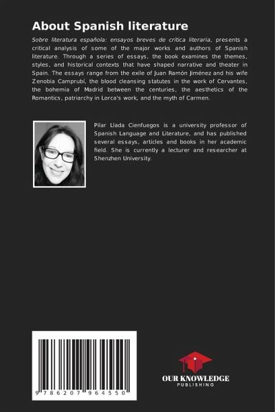 Sobre literatura española: ensayos breves de crítica literaria, presents a critical analysis of some of the major works and authors of Spanish literature. Through a series of essays, the book examines the themes, styles, and historical contexts that have shaped narrative and theater in Spain. The essays range from the exile of Juan Ramón Jiménez and his wife Zenobia Camprubí, the blood cleansing statutes in the work of Cervantes, the bohemia of Madrid between the centuries, the aesthetics of the Romantics, patriarchy in Lorca's work, and the myth of Carmen.