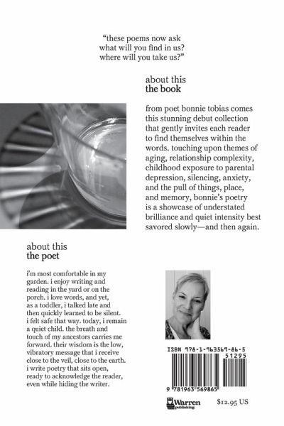 from poet bonnie tobias comes this stunning debut collection that gently invites each reader to find themselves within the words. touching upon themes of aging, relationship complexity, childhood exposure to parental depression, silencing, anxiety, and the pull of things, place, and memory, bonnie's poetry is a showcase of understated brilliance and quiet intensity best savored slowly-and then again.