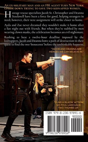 Perfect for those who love thrillers with a good and decent main character - noble friends - action - clean language - no graphic sex - a little romance - and an undertone of faith from a Christian worldview. An ex-military man and an FBI agent turn New York upside down trying to save two kidnapped women. Hostage rescue specialists Jacob St. Christopher and Deanna Stockwell have been a force for good, helping strangers in need; however, their next assignment will strike closer to home. Ayda and Zoe never dreamed they wouldn't make it home after a fun night out with friends. But when they're nabbed by men wearing clown masks, the celebration becomes an evil nightmare. Rushing to beat a twelve-hour deadline imposed by the kidnappers, Jacob and Deanna leave a path of destruction in their quest to find the two 'Innocents' before the unthinkable happens. Action-packed, clean-language hostage rescue thriller where evil people prey upon the weak, and where two unsanctioned hostage rescue specialists stand ready to step into the breach to save those in need. - Book #4 in the Jacob St. Christopher series of Action Thrillers -