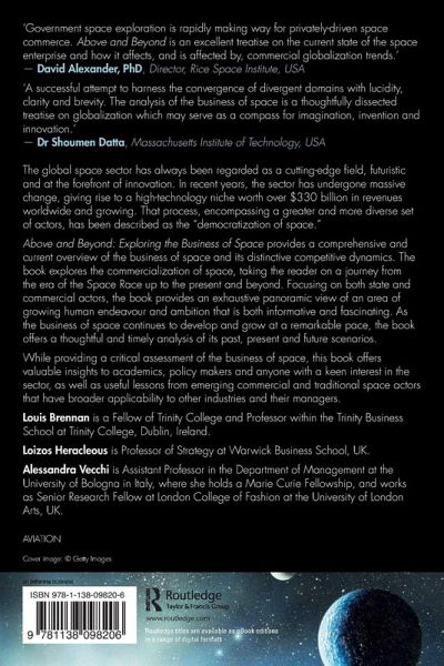 The global space sector has always been regarded as a cutting-edge field, futuristic and at the forefront of innovation. In recent years, the sector has undergone massive change, giving rise to a high-technology niche worth over $330 billion in revenues worldwide and growing. That process, encompassing a greater and more diverse set of actors, has been described as the "democratization of space." Above and Beyond: Exploring the Business of Space provides a comprehensive and current overview of the business of space and its distinctive competitive dynamics. The book explores the commercialization of space, taking the reader on a journey from the era of the Space Race up to the present and beyond. Focusing on both state and commercial actors, the book provides an exhaustive panoramic view of an area of growing human endeavour and ambition that is both informative and fascinating. As the business of space continues to develop and grow at a remarkable pace, the book offers a thoughtful and timely analysis of its past, present and future scenarios. While providing a critical assessment of the business of space, this book offers valuable insights to academics, policy makers and anyone with a keen interest in the sector, as well as useful lessons from emerging commercial and traditional space actors that have broader applicability to other industries and their managers.