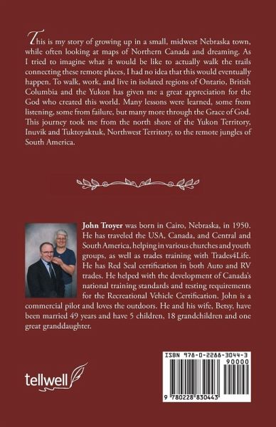 This is my story of growing up in a small, midwest Nebraska town, while often looking at maps of Northern Canada and dreaming. As I tried to imagine what it would be like to actually walk the trails connecting these remote places, I had no idea that this would eventually happen. To walk, work, and live in isolated regions of Ontario, British Columbia and the Yukon has given me a great appreciation for the God who created this world. Many lessons were learned, some from listening, some from failure, but many more through the Grace of God. This journey took me from the north shore of the Yukon Territory, Inuvik and Tuktoyaktuk, Northwest Territory, to the remote jungles of South America.