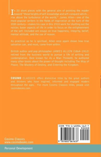 In 20 short pieces with the general aim of pointing the reader toward "those heights of self-knowledge and self-conquest which...rise above the turbulence of the world," James Allen-one of the most popular writers in the fields of inspiration at the turn of the 20th century-makes his case in this 1910 work for shutting out the noisier, baser aspects of life in order to focus on the enlightenment of the self. Included are essays on true happiness, integrity, belief, mental attitude, and the use of reason. As practical as he is spiritual, Allen once again shows how true salvation can, and must, come from within. British author and pop philosopher JAMES ALLEN (1864-1912) retired from the business world to pursue a life of writing and contemplation. Best known for As a Man Thinketh, he authored many other books about the power of thought including The Way of Peace, The Mastery of Destiny, and Entering the Kingdom.