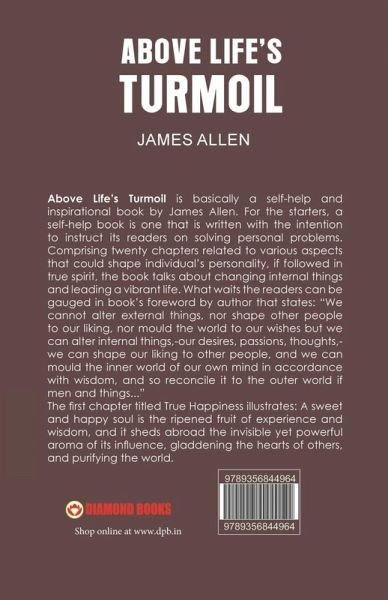 Above Lifes Turmoil is basically a self-help and inspirational book by James Allen. For the starters, a self-help book is one that is written with the intention to instruct its readers on solving personal problems. Comprising twenty chapters related to various aspects that could shape individuals personality, if followed in true spirit, the book talks about changing internal things and leading a vibrant life. What waits the readers can be gauged in books foreword by author that states: We cannot alter external things, nor shape other people to our liking, nor mould the world to our wishes but we can alter internal things,-our desires, passions, thoughts,-we can shape our liking to other people, and we can mould the inner world of our own mind in accordance with wisdom, and so reconcile it to the outer world if men and things... The first chapter titled True Happiness illustrates: A sweet and happy soul is the ripened fruit of experience and wisdom, and it sheds abroad the invisible yet powerful aroma of its influence, gladdening the hearts of others, and purifying the world.