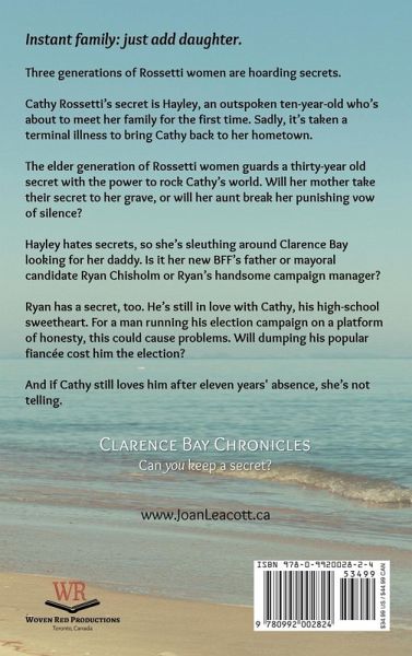 Three generations of Rossetti women are hoarding secrets. Cathy Rossetti’s secret is Hayley, an outspoken ten-year-old who’s about to meet her family for the first time. Sadly, it’s taken a terminal illness to bring Cathy back to her hometown. The elder generation of Rossetti women guards a thirty-year old secret with the power to rock Cathy’s world. Will her mother take their secret to her grave, or will her aunt break her punishing vow of silence? Hayley hates secrets, so she’s sleuthing around Clarence Bay looking for her daddy. Is it her new BFF’s father or mayoral candidate Ryan Chisholm or Ryan’s handsome campaign manager? Ryan has a secret, too. He’s still in love with Cathy, his high-school sweetheart. For a man running his election campaign on a platform of honesty, this could cause problems. Will dumping his popular fiancée cost him the election? And if Cathy still loves him after eleven years' absence, she’s not telling.