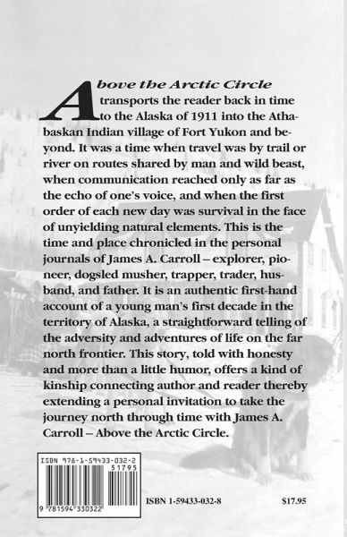 Above the Arctic Circle transports the reader back in time to the Alaska of 1911 into the Athabaskan Indian village of Fort Yukon and beyond. It was a time when travel was by trail or river on routes shared by man and wild beast, when communication reached only as far as the echo of one's voice, and when the first order of each new day was survival in the face of unyielding natural elements. This is the time and place chronicled in the personal journals of James A. Carroll: explorer, pioneer, dogsled musher, trapper, trader, husband, and father. It is an authentic first-hand account of a young man's first decade in the territory of Alaska, a straightforward telling of the adversity and adventures of life on the far north frontier. This story, told with honesty and more than a little humor, offers a kind of kinship connecting author and reader thereby extending a personal invitation to take the journey north through time with James A. Carroll -- Above the Arctic Circle.