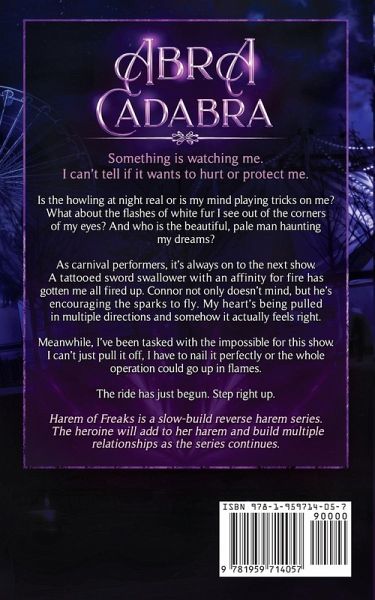 Something is watching me. I can't tell if it wants to hurt or protect me. Is the howling at night real or is my mind playing tricks on me? What about the flashes of white fur I see out of the corners of my eyes? And who is the beautiful, pale man haunting my dreams? As carnival performers, it's always on to the next show. A tattooed sword swallower with an affinity for fire has gotten me all fired up. Connor not only doesn't mind, but he's encouraging the sparks to fly. My heart's being pulled in multiple directions and somehow it actually feels right. Meanwhile, I've been tasked with the impossible for this show. I can't just pull it off, I have to nail it perfectly or the whole operation could go up in flames. The ride has just begun. Step right up. Abra Cadabra is the second installment in the Harem of Freaks series. These books are not standalones, so be sure to read Freak Show first.