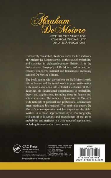 This book is the first biography of Abraham De Moivre based on recently discovered material. It discusses the status of statistics and probability before and during De Moivre's time. The text covers his theories as well as the work of key players and those he influenced. Along with exploring the development of probability theory, the book describes its applications in medicine, insurance, and astronomy. It also examines the diffusion of ideas about probability in popular literature.