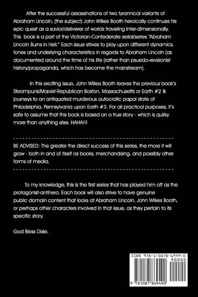 After the successful assassinations of two tyrannical variants of Abraham Lincoln, (the subject) John Wilkes Booth heroically continues his epic quest as a savior/deliverer of worlds traveling inter-dimensionally. This book is a part of the Victorian-Confederate serial/series "Abraham Lincoln Burns In Hell." Each issue strives to play upon different dynamics, tones and underlying characteristics in regards to Abraham Lincoln (as documented around the time of his life (rather than psuedo-revisionist history/propaganda, which has become the mainstream). In this exciting issue, John Wilkes Booth leaves the previous book's Steampunk/Marxist-Republican Boston, Massachusetts or Earth #2 & journeys to an antiquated murderous autocratic papal state of Philadelphia, Pennsylvania upon Earth #3. For all practical purposes, it's safe to assume that this book is based on a true story - which is quirky more than anything else. HAHA!!! ***BE ADVISED: The greater the direct success of this series, the more it will grow - both in and of itself as books, merchandising, and possibly other forms of media.*** To my knowledge, this is the first series that has played him off as the protagonist-antihero. Each book will also strive to have genuine public domain content that looks at Abraham Lincoln, John Wilkes Booth, or perhaps other characters involved in that issue, as they pertain to its specific story. God Bless Dixie.