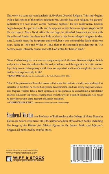 This work is a summary and analysis of Abraham Lincoln's religion. This study begins with a description of the earliest relations Mr. Lincoln had with religion, his parents' dedication to a sect known as the "Separate Baptists." By late adolescence, Lincoln began to reject his parents' faith, and he appears to have been a religious skeptic until his marriage to Mary Todd. After his marriage, he attended Protestant services with his wife and family, but there was little evidence that he was deeply religious in that time. Lincoln knew the Scriptures quite well, but it was not until the death of his two sons, Eddie in 1850 and Willie in 1862, that as the sixteenth president put it, "He became more intensely concerned with God's Plan for human kind."