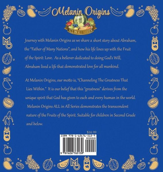 Journey with Melanin Origins as we share a short story about Abraham, the "Father of Many Nations", and how his life lines up with the Fruit of the Spirit: Love. As a believer dedicated to doing God's Will, Abraham lived a life that demonstrated love for all mankind. At Melanin Origins, our motto is, "Channeling The Greatness That Lies Within." It is our belief that this "greatness" derives from the unique spirit that God has given to each and every human in the world. Melanin Origins ALL in All Series demonstrates the transcendent nature of the Fruits of the Spirit. Suitable for children in Second Grade and below.