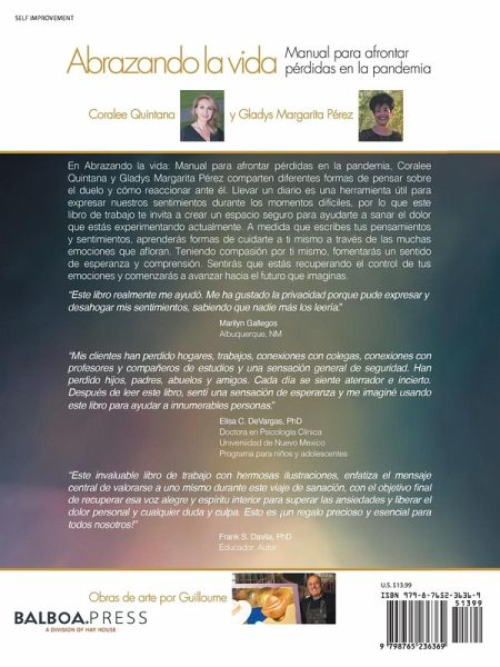 En "Abrazando la vida": Manual para afrontar pérdidas en la pandemia, Coralee Quintana y Gladys Margarita Pérez comparten diferentes formas de pensar sobre el duelo y cómo reaccionar ante él. Llevar un diario es una herramienta útil para expresar nuestros sentimientos durante los momentos difíciles, por lo que este libro de trabajo te invita a crear un espacio seguro para ayudarte a sanar el dolor que estás experimentando actualmente. A medida que escribes tus pensamientos y sentimientos, aprenderás formas de cuidarte a ti mismo a través de las muchas emociones que afloran. Teniendo compasión por ti mismo, fomentaras un sentido de esperanza y comprensión. Sentirás que estás recuperando el control de tus emociones y comenzarás a avanzar hacia el futuro que imaginas. "Este libro realmente me ayudo. Me ha gustado la privacidad por que pude expresar y desahogar mis sentimientos, s a b i e ndo que nadie mas los leería." Marilyn Gallegos, Albuquerque, NM "Mis clientes han perdido hogares, trabajos, conexiones con colegas, conexiones con profesores y compañeros de estudios y una sensación general de seguridad. Han perdido hijos, padres, abuelos y amigos. Cada día se siente aterrador e incierto. Después de leer este libro, sentí una sensación de esperanza y me imaginé usando este libro para ayudar a innum e r a bles personas." Elisa C. DeVargas, PhD Doctora en Psicología Clínica Universidad de Nuevo Mexico Programa para niños y adolescentes "Este invaluable libro de trabajo con hermosas ilustraciones, enfatiza el mensaje central de valorarse a uno mismo durante este viaje de sanación, con el objetivo final de recuperar esa voz alegre y espíritu interior para superar las ansiedades y liberar el dolor personal y cualquier duda y culpa. Esto es ¡un regalo precioso y esencial para todos nosotros!" Frank S. Davila, PhD Educador, Autor