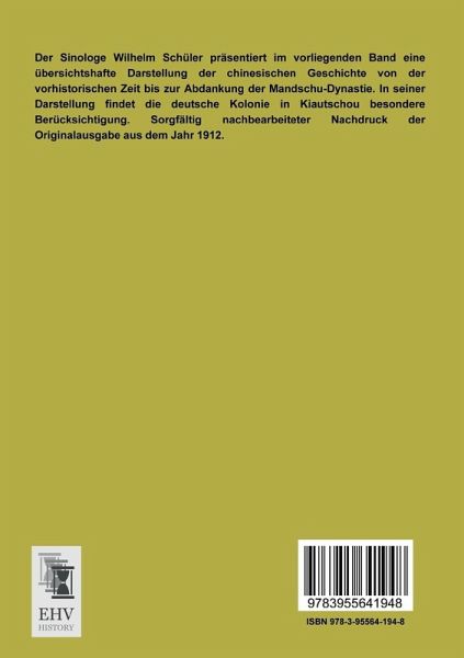 Der Sinologe Wilhelm Schüler präsentiert im vorliegenden Band eine übersichtshafte Darstellung der chinesischen Geschichte von der vorhistorischen Zeit bis zur Abdankung der Mandschu-Dynastie. In seiner Darstellung findet die deutsche Kolonie in Kiautschou besondere Berücksichtigung. Sorgfältig nachbearbeiteter Nachdruck der Originalausgabe aus dem Jahr 1912.