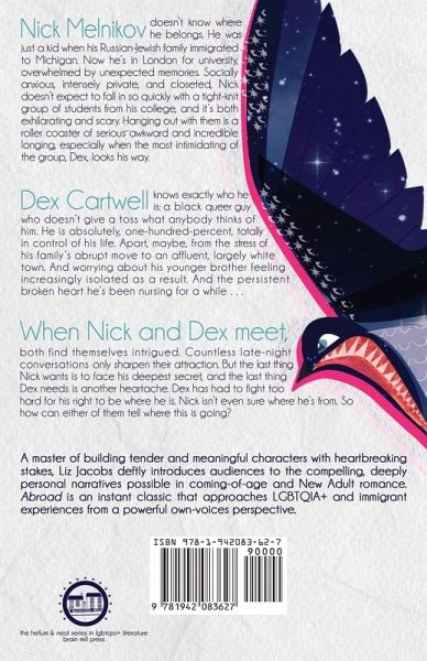 "A nuanced and sexy take on growing up and learning to accept who you are." —Teen Vogue Nick Melnikov doesn’t know where he belongs. He was just a kid when his Russian-Jewish family immigrated to Michigan. Now he’s in London for university, overwhelmed by unexpected memories. Socially anxious, intensely private, and closeted, Nick doesn’t expect to fall in so quickly with a tight-knit group of students from his college, and it’s both exhilarating and scary. Hanging out with them is a roller coaster of serious awkward and incredible longing, especially when the most intimidating of the group, Dex, looks his way. Dex Cartwell knows exactly who he is: a black queer guy who doesn’t give a toss what anybody thinks of him. He is absolutely, one-hundred-percent, totally in control of his life. Apart, maybe, from the stress of his family’s abrupt move to an affluent, largely white town. And worrying about his younger brother feeling increasingly isolated as a result. And the persistent broken heart he’s been nursing for a while . . . When Nick and Dex meet, both find themselves intrigued. Countless late-night conversations only sharpen their attraction. But the last thing Nick wants is to face his deepest secret, and the last thing Dex needs is another heartache. Dex has had to fight too hard for his right to be where he is. Nick isn’t even sure where he’s from. So how can either of them tell where this is going? A master of building tender and meaningful characters with heartbreaking stakes, Liz Jacobs deftly introduces audiences to the compelling, deeply personal narratives possible in coming-of-age and New Adult romance. ABROAD is an instant classic that approaches LGBTQIA+ and immigrant experiences from a powerful own-voices perspective.