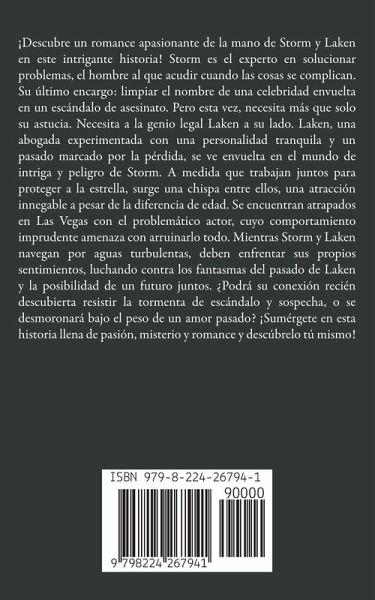 ¡Descubre un romance apasionante de la mano de Storm y Laken en este intrigante historia! Storm es el experto en solucionar problemas, el hombre al que acudir cuando las cosas se complican. Su último encargo: limpiar el nombre de una celebridad envuelta en un escándalo de asesinato. Pero esta vez, necesita más que solo su astucia. Necesita a la genio legal Laken a su lado. Laken, una abogada experimentada con una personalidad tranquila y un pasado marcado por la pérdida, se ve envuelta en el mundo de intriga y peligro de Storm. A medida que trabajan juntos para proteger a la estrella, surge una chispa entre ellos, una atracción innegable a pesar de la diferencia de edad. Se encuentran atrapados en Las Vegas con el problemático actor, cuyo comportamiento imprudente amenaza con arruinarlo todo. Mientras Storm y Laken navegan por aguas turbulentas, deben enfrentar sus propios sentimientos, luchando contra los fantasmas del pasado de Laken y la posibilidad de un futuro juntos. ¿Podrá su conexión recién descubierta resistir la tormenta de escándalo y sospecha, o se desmoronará bajo el peso de un amor pasado? ¡Sumérgete en esta historia llena de pasión, misterio y romance y descúbrelo tú mismo!