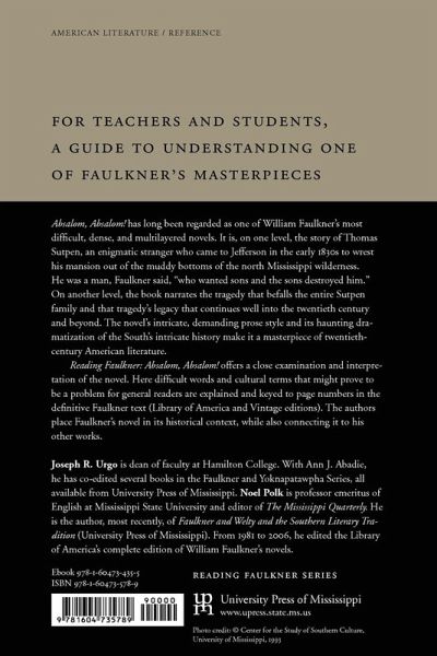 For teachers and students, a guide to understanding one of Faulkner's masterpieces Absalom, Absalom! has long been regarded as one of William Faulkner's most difficult, dense, and multilayered novels. It is, on one level, the story of Thomas Sutpen, an enigmatic stranger who came to Jefferson in the early 1830s to wrest his mansion out of the muddy bottoms of the north Mississippi wilderness. He was a man, Faulkner said, "who wanted sons and the sons destroyed him." On another level, the book narrates the tragedy that befalls the entire Sutpen family and that tragedy's legacy that continues well into the twentieth century and beyond. The novel's intricate, demanding prose style and its haunting dramatization of the South's intricate history make it a masterpiece of twentieth¿century American literature. Reading Faulkner: Absalom, Absalom! offers a close examination and interpretation of the novel. Here difficult words and cultural terms that might prove to be a problem for general readers are explained and keyed to page numbers in the definitive Faulkner text (Library of America and Vintage editions). The authors place Faulkner's novel in its historical context, while also connecting it to his other works. Joseph R. Urgo is dean of faculty at Hamilton College. With Ann J. Abadie, he has cöedited several books in the Faulkner and Yoknapatawpha Series, all available from University Press of Mississippi. Noel Polk is professor emeritus of English at Mississippi State University and editor of The Mississippi Quarterly. He is the author, most recently, of Faulkner and Welty and the Southern Literary Tradition (University Press of Mississippi). From 1981 to 2006, he edited the Library of America's complete edition of William Faulkner's novels.