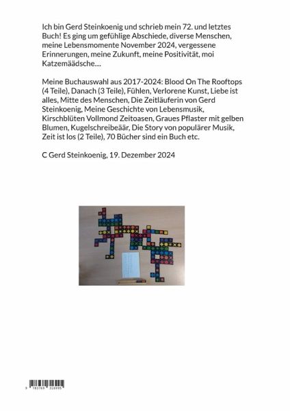 Ich bin Gerd Steinkoenig und schrieb mein 72. und letztes Buch! Es ging um gefühlige Abschiede, diverse Menschen, meine Lebensmomente November 2024, vergessene Erinnerungen, meine Zukunft, meine Positivität, moi Katzemäädsche.... Meine Buchauswahl aus 2017-2024: Blood On The Rooftops (4 Teile), Danach (3 Teile), Fühlen, Verlorene Kunst, Liebe ist alles, Mitte des Menschen, Die Zeitläuferin von Gerd Steinkoenig, Meine Geschichte von Lebensmusik, Kirschblüten Vollmond Zeitoasen, Graues Pflaster mit gelben Blumen, Kugelschreibeäär, Die Story von populärer Musik, Zeit ist los (2 Teile), 70 Bücher sind ein Buch etc. C Gerd Steinkoenig, 19. Dezember 2024