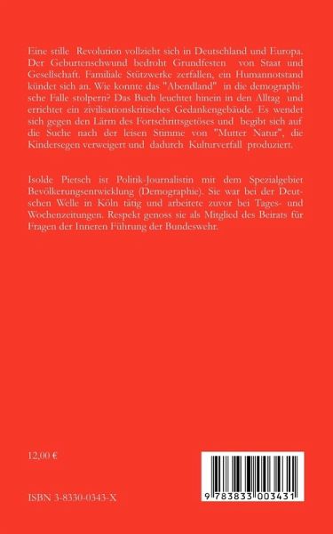 Die Zukunft Deutschlands und Europas ist geprägt vom Altern der Bevölkerung und von Jugendmangel. Hauptgrund dafür bildet das aussergewöhnliche Phänomen zu geringer Geburtenzahlen. Damit einher geht der Zerfall familiärer Stützwerke, was wiederum tiefgreifende Auswirkungen auf Gesellschaft, Staat und Wirtschaft hat. Das Buch forscht nach den Gründen für diese stille Revolution und beschreibt ihre umstürzenden Folgen nicht zuletzt im Blick auf Zuwanderung aus islamisch geprägten Kulturkreisen. Vor dem Hintergrund des demographischen Debakels und der damit verquickten Humankrise schildert die Autorin die Irrwege einer Zivilisation, die scheinbar alles erwartet von wissenschaftlichem Wissen, es dagegen offenbar verlernt hat, den Kraftströmen der im Leben verwurzelten Weisheit zu folgen.