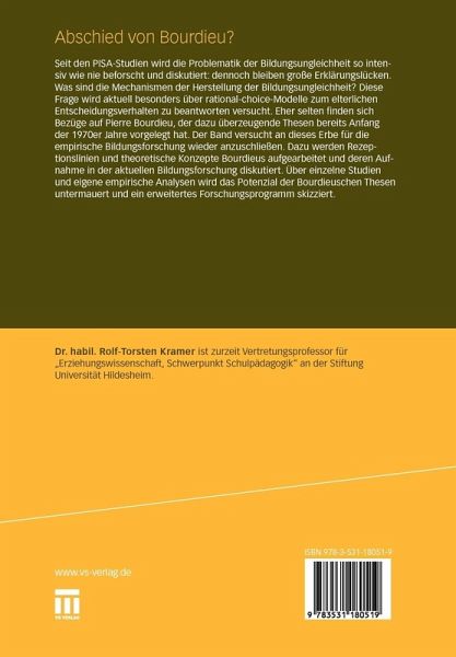 Seit den PISA-Studien wird die Problematik der Bildungsungleichheit so intensiv wie nie beforscht und diskutiert: dennoch bleiben große Erklärungslücken. Was sind die Mechanismen der Herstellung der Bildungsungleichheit? Diese Frage wird aktuell besonders über rational-choice-Modelle zum elterlichen Entscheidungsverhalten zu beantworten versucht. Eher selten finden sich Bezüge auf Pierre Bourdieu, der dazu überzeugende Thesen bereits Anfang der 1970er Jahre vorgelegt hat. Der Band versucht an dieses Erbe für die empirische Bildungsforschung wieder anzuschließen. Dazu werden Rezeptionslinien und theoretische Konzepte Bourdieus aufgearbeitet und deren Aufnahme in der aktuellen Bildungsforschung diskutiert. Über einzelne Studien und eigene empirische Analysen wird das Potenzial der Bourdieuschen Thesen untermauert und ein erweitertes Forschungsprogramm skizziert.