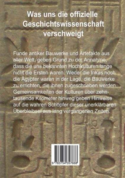 Alte Kulturen haben uns Bauwerke und Artefakte hinterlassen, deren Ursprung unerklärbar ist. Haben die Inkas wirklich die gigantischen Zyklopenmauern erbaut? Warum stehen dieselben Mauern auch auf der Osterinsel? Hat Cheops wirklich die große Pyramide erbaut .All diese, und noch viele weitere schulwissenschaftliche Behauptungen werden in diesem Buch anhand von Fakten hinterfragt. Die heute noch bekannten Kulturen der letzten 12.000 Jahre hatten einen gemeinsamen Ursprung, einen gemeinsamen Baumeister und folgten demselben großen Plan. Dieser Ursprung war der Ort, von dem die "Götter" kamen, die die Zivilisationen gründeten, und die den Menschen Wissen und Kultur brachten. Diese "Götter" waren die Überlebenden der Sintflut.