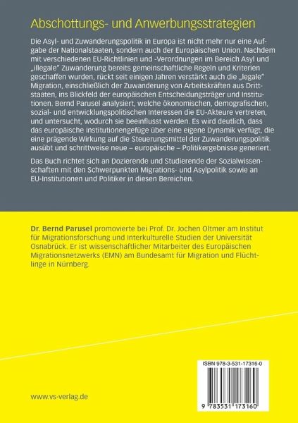 Die Asyl- und Zuwanderungspolitik in Europa ist nicht mehr nur eine Aufgabe der Nationalstaaten, sondern auch der Europäischen Union. Nachdem mit verschiedenen EU-Richtlinien und -Verordnungen im Bereich Asyl und "illegale" Zuwanderung bereits gemeinschaftliche Regeln und Kriterien geschaffen wurden, rückt seit einigen Jahren verstärkt auch die "legale" Migration, einschließlich der Zuwanderung von Arbeitskräften aus Drittstaaten, ins Blickfeld der europäischen Entscheidungsträger und Institutionen. Bernd Parusel analysiert, welche ökonomischen, demografischen, sozial- und entwicklungspolitischen Interessen die EU-Akteure vertreten, und untersucht, wodurch sie beeinflusst werden. Es wird deutlich, dass das europäische Institutionengefüge über eine eigene Dynamik verfügt, die eine prägende Wirkung auf die Steuerungsmittel der Zuwanderungspolitik ausübt und schrittweise neue - europäische - Politikergebnisse generiert.