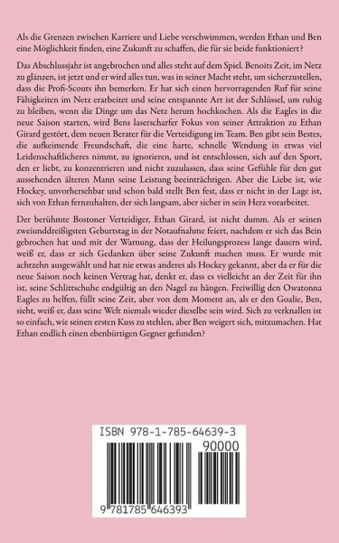 Als die Grenzen zwischen Karriere und Liebe verschwimmen, werden Ethan und Ben eine Möglichkeit finden, eine Zukunft zu schaffen, die für sie beide funktioniert? Das Abschlussjahr ist angebrochen und alles steht auf dem Spiel. Benoits Zeit, im Netz zu glänzen, ist jetzt und er wird alles tun, was in seiner Macht steht, um sicherzustellen, dass die Profi-Scouts ihn bemerken. Er hat sich einen hervorragenden Ruf für seine Fähigkeiten im Netz erarbeitet und seine entspannte Art ist der Schlüssel, um ruhig zu bleiben, wenn die Dinge um das Netz herum hochkochen. Als die Eagles in die neue Saison starten, wird Bens laserscharfer Fokus von seiner Attraktion zu Ethan Girard gestört, dem neuen Berater für die Verteidigung im Team. Ben gibt sein Bestes, die aufkeimende Freundschaft, die eine harte, schnelle Wendung in etwas viel Leidenschaftlicheres nimmt, zu ignorieren, und ist entschlossen, sich auf den Sport, den er liebt, zu konzentrieren und nicht zuzulassen, dass seine Gefühle für den gut aussehenden älteren Mann seine Leistung beeinträchtigen. Aber die Liebe ist, wie Hockey, unvorhersehbar und schon bald stellt Ben fest, dass er nicht in der Lage ist, sich von Ethan fernzuhalten, der sich langsam, aber sicher in sein Herz vorarbeitet. Der berühmte Bostoner Verteidiger, Ethan Girard, ist nicht dumm. Als er seinen zweiunddreißigsten Geburtstag in der Notaufnahme feiert, nachdem er sich das Bein gebrochen hat und mit der Warnung, dass der Heilungsprozess lange dauern wird, weiß er, dass er sich Gedanken über seine Zukunft machen muss. Er wurde mit achtzehn ausgewählt und hat nie etwas anderes als Hockey gekannt, aber da er für die neue Saison noch keinen Vertrag hat, denkt er, dass es vielleicht an der Zeit für ihn ist, seine Schlittschuhe endgültig an den Nagel zu hängen. Freiwillig den Owatonna Eagles zu helfen, füllt seine Zeit, aber von dem Moment an, als er den Goalie, Ben, sieht, weiß er, dass seine Welt niemals wieder dieselbe sein wird. Sich zu verknallen ist so einfach, wie seinen ersten Kuss zu stehlen, aber Ben weigert sich, mitzumachen. Hat Ethan endlich einen ebenbürtigen Gegner gefunden?