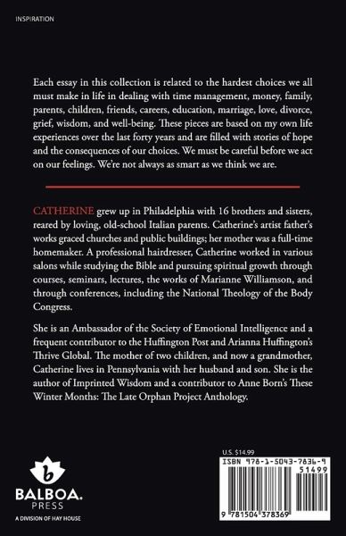 Each essay in this collection is related to the hardest choices we all must make in life in dealing with time management, money, family, parents, children, friends, careers, education, marriage, love, divorce, grief, wisdom, and well-being. These pieces are based on my own life experiences over the last forty years and are filled with stories of hope and the consequences of our choices. We must be careful before we act on our feelings. We're not always as smart as we think we are.