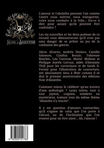 L'amour et l'absinthe peuvent l'un comme l'autre nous enivrer, nous transporter, voire nous conduire à al folie... Est-ce à dire pour autant qu'ils peuvent être confondus ? Les six nouvelles et les deux poèmes de ce recueil démontreront qu'il n'est pas sans danger de se prêter au jeu de la confusion des genres. Ces textes, tour à tour joyeux, coquins, sombres ou mystérieux traitent tous du même thème "Absinthe n'y touche". Il y est question d'amours contrariées, qu'il s'agisse de celui que l'on porte à l'alcool, ou de l'inclination que l'on ressent pour l'être aimé... Ah, l'amour !