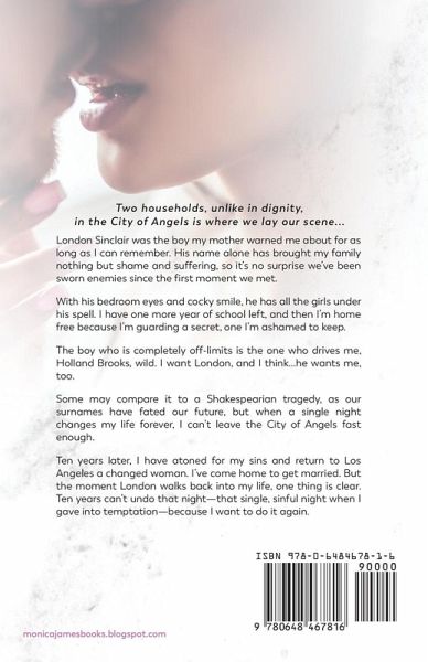 Two households, unlike in dignity, in the City of Angels is where we lay our scene... London Sinclair was the boy my mother warned me about for as long as I can remember. His name alone has brought my family nothing but shame and suffering, so it’s no surprise we’ve been sworn enemies since the first moment we met. With his bedroom eyes and cocky smile, he has all the girls under his spell. I have one more year of school left, and then I’m home free because I’m guarding a secret, one I’m ashamed to keep. The boy who is completely off-limits is the one who drives me, Holland Brooks, wild. I want London, and I think…he wants me, too. Some may compare it to a Shakespearian tragedy, as our surnames have fated our future, but when a single night changes my life forever, I can’t leave the City of Angels fast enough. Ten years later, I have atoned for my sins and return to Los Angeles a changed woman. I’ve come home to get married. But the moment London walks back into my life, one thing is clear. Ten years can’t undo that night—that single, sinful night when I gave into temptation—because I want to do it again.
