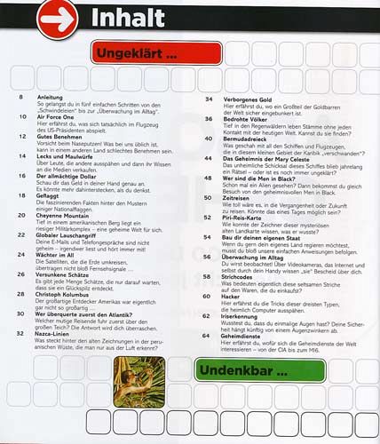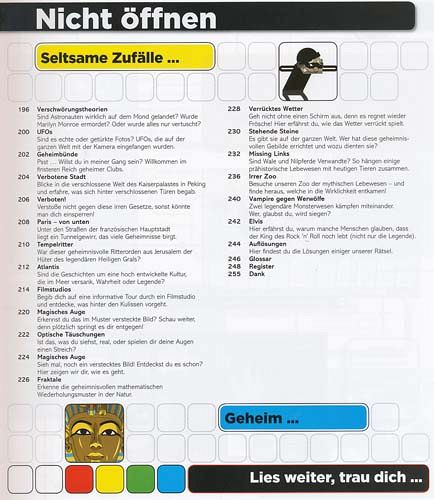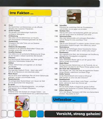 Was Kinder wirklich interessiert - hier steht's drin! In "Absolut geheim!" erfahren neugierige Leser einfach alles über die rätselhaftesten Fakten, die kuriosesten Ereignisse und die mysteriösesten Phänomene der Welt. Ob Verschwörungstheorien, UFOs, der Fluch des Tutanchamun, der große Lauschangriff oder ungelöste Mordfälle: dieses Buch deckt geheimes Wissen schonungslos auf und gewährt einen spannenden Blick in die Hintergründe scheinbar unerklärlicher Vorkommnisse. Unkonventionell illustriert und einfach gnadenlos ehrlich wird dort unter anderem enthüllt, wie bekannte Zaubertricks, magische Zahlen oder optische Täuschungen funktionieren. Ein kunterbuntes, locker geschriebenes Sammelsurium voll skurrilem Wissen, das sich nicht überall nachschlagen lässt - spektakulär verpackt in einer coolen Magnet-Gitterbox.