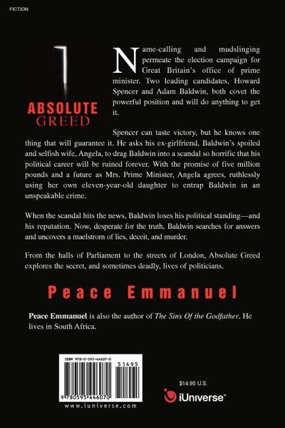 Name-calling and mudslinging permeate the election campaign for Great Britain's office of prime minister. Two leading candidates, Howard Spencer and Adam Baldwin, both covet the powerful position and will do anything to get it. Spencer can taste victory, but he knows one thing that will guarantee it. He asks his ex-girlfriend, Baldwin's spoiled and selfish wife, Angela, to drag Baldwin into a scandal so horrific that his political career will be ruined forever. With the promise of five million pounds and a future as Mrs. Prime Minister, Angela agrees, ruthlessly using her own eleven-year-old daughter to entrap Baldwin in an unspeakable crime. When the scandal hits the news, Baldwin loses his political standing-and his reputation. Now, desperate for the truth, Baldwin searches for answers and uncovers a maelstrom of lies, deceit, and murder. From the halls of Parliament to the streets of London, Absolute Greed explores the secret, and sometimes deadly, lives of politicians.