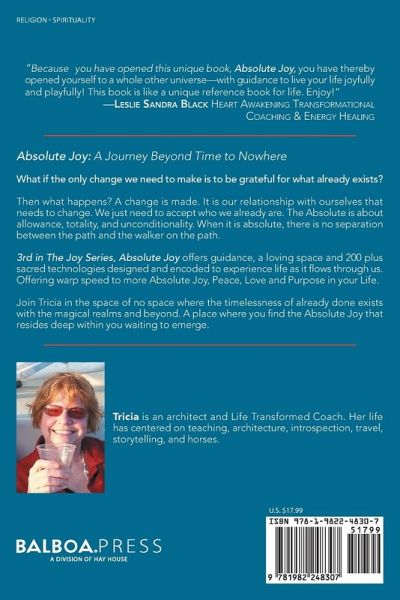 Absolute Joy: A Journey Beyond Time to Nowhere What if the only change we need to make is to be grateful for what already exists? Then what happens? A change is made. It is our relationship with ourselves that needs to change. We just need to accept who we already are. The Absolute is about allowance, totality, and unconditionality. When it is absolute, there is no separation between the path and the walker on the path. 3rd in The Joy Series, Absolute Joy offers guidance, a loving space and 200 plus sacred technologies designed and encoded to experience life as it flows through us. Offering warp speed to more Absolute Joy, Peace, Love and Purpose in your Life. Join Tricia in the space of no space where the timelessness of already done exists with the magical realms and beyond. A place where you find the Absolute Joy that resides deep within you waiting to emerge.