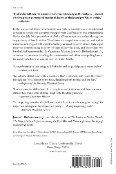 In the summer of 1866, racial tensions ran high in Louisiana as a constitutional convention considered disenfranchising former Confederates and enfranchising blacks. On July 30, a procession of black suffrage supporters pushed through an angry throng of hostile whites. Words were exchanged, shots rang out, and within minutes a riot erupted with unrestrained fury. When it was over, at least forty-eight men -- an overwhelming majority of them black -- lay dead and more than two hundred had been wounded. In An Absolute Massacre, James G. Hollandsworth, Jr., examines the events surrounding the confrontation and offers a compelling look at the racial tinderbox that was the post-Civil War South.