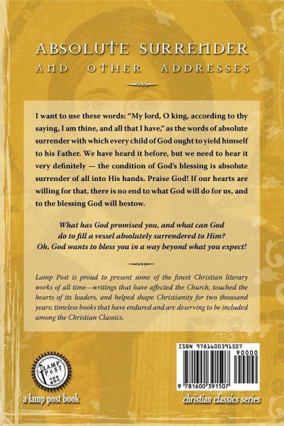 I want to use these words: "My lord, O king, according to thy saying, I am thine, and all that I have," as the words of absolute surrender with which every child of God ought to yield himself to his Father. We have heard it before, but we need to hear it very definitely - the condition of God's blessing is absolute surrender of all into His hands. Praise God! If our hearts are willing for that, there is no end to what God will do for us, and to the blessing God will bestow. What has God promised you, and what can God do to fill a vessel absolutely surrendered to Him? Oh, God wants to bless you in a way beyond what you expect! Lamp Post is proud to present some of the finest Christian literary works of all time-writings that have affected the Church, touched the hearts of its leaders, and helped shape Christianity for two thousand years; timeless books that have endured and are deserving to be included among the Christian Classics.